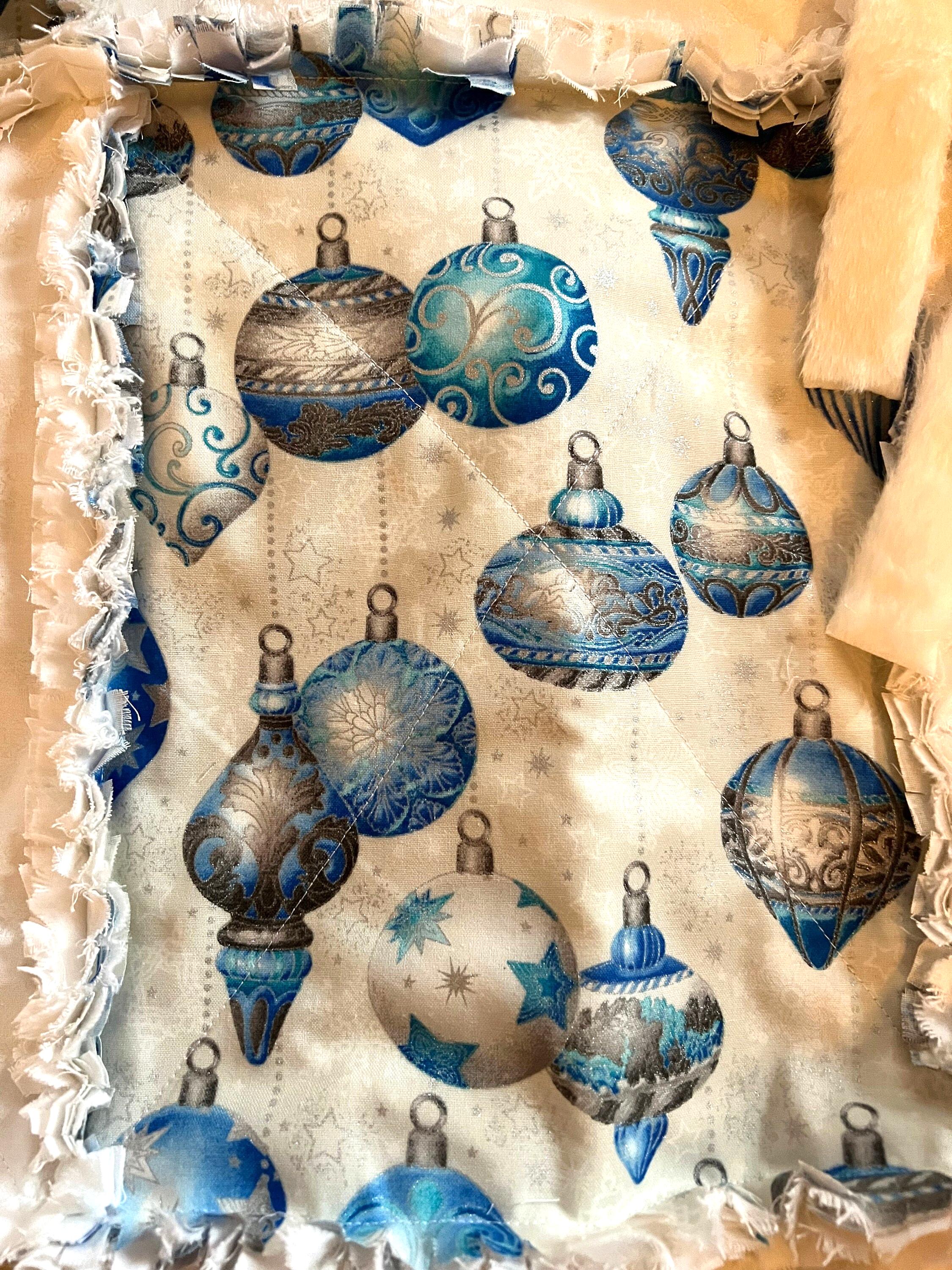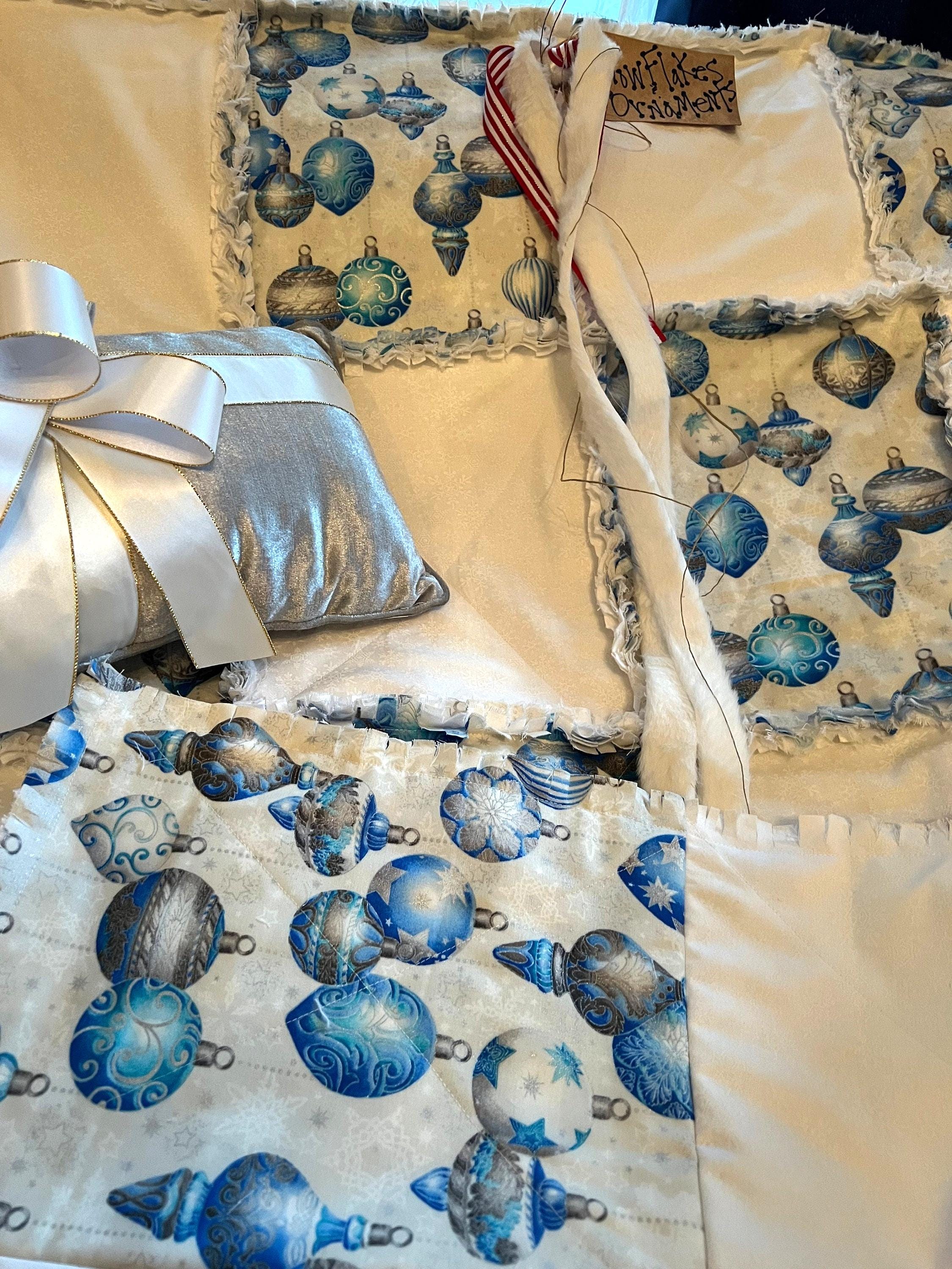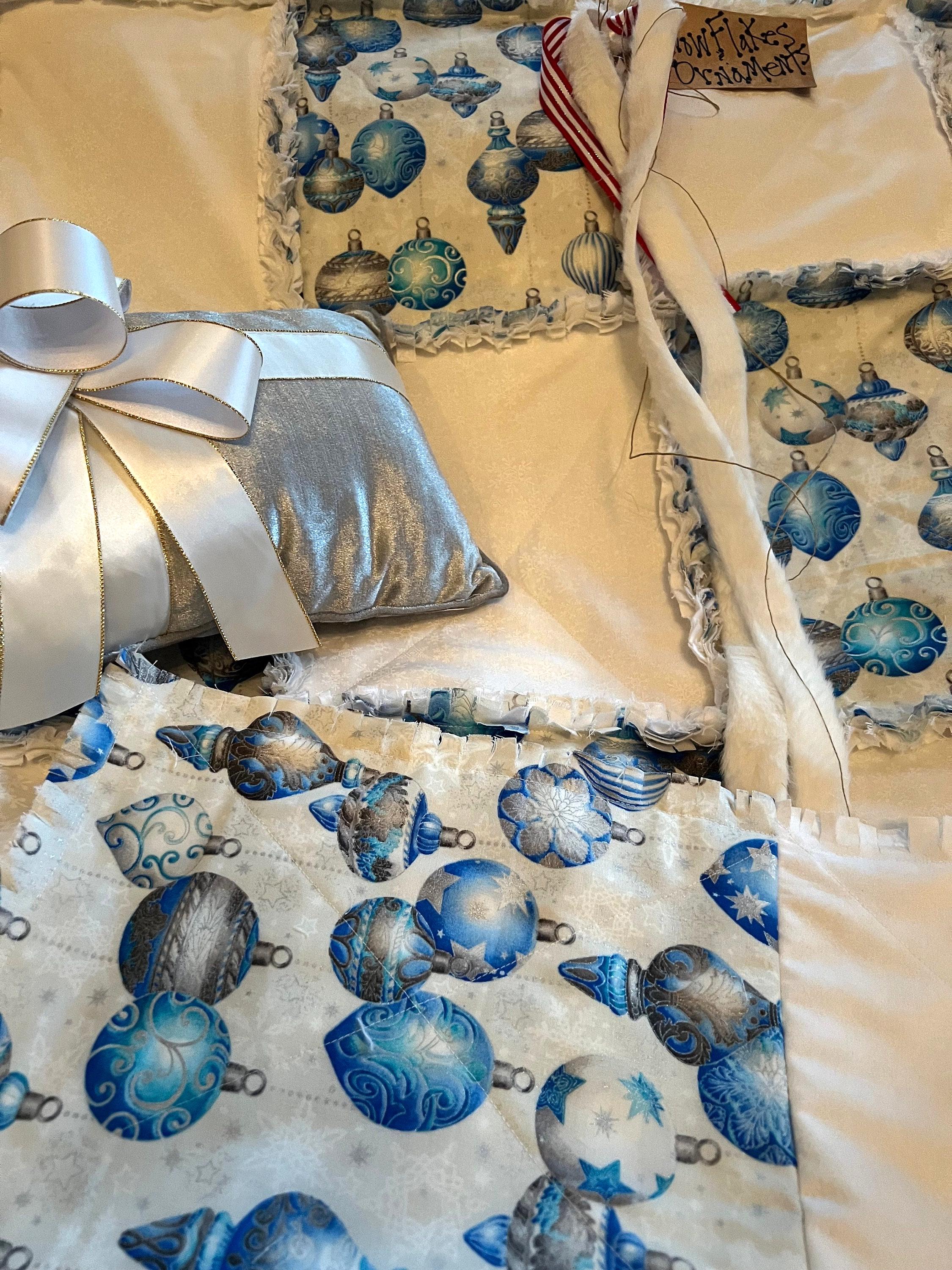 Christmas Blue Ornament Rag Quilt Throw. Handmade