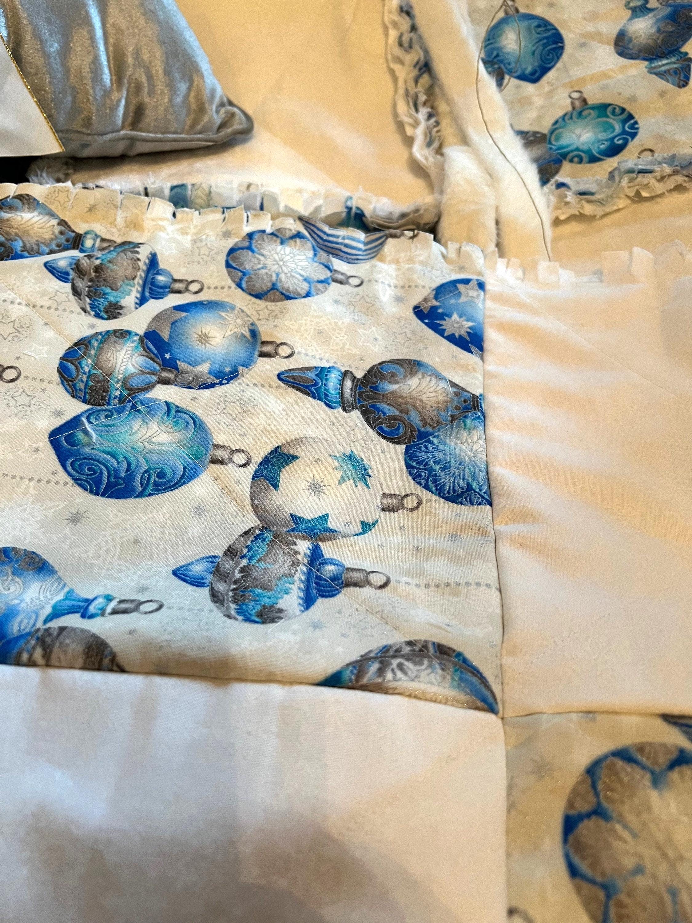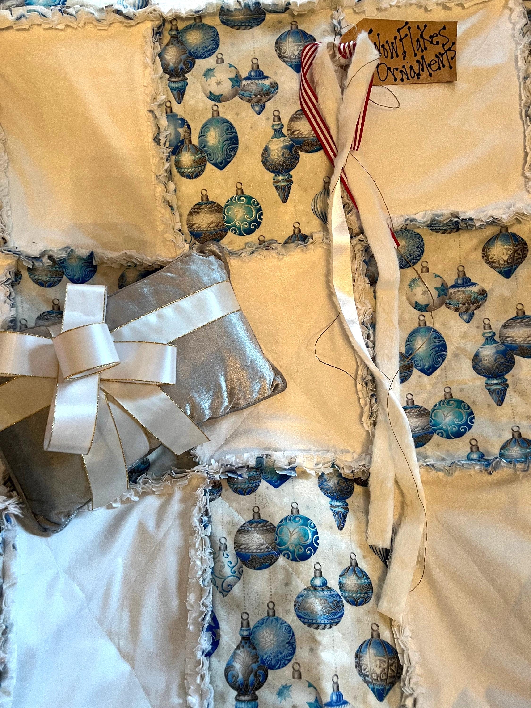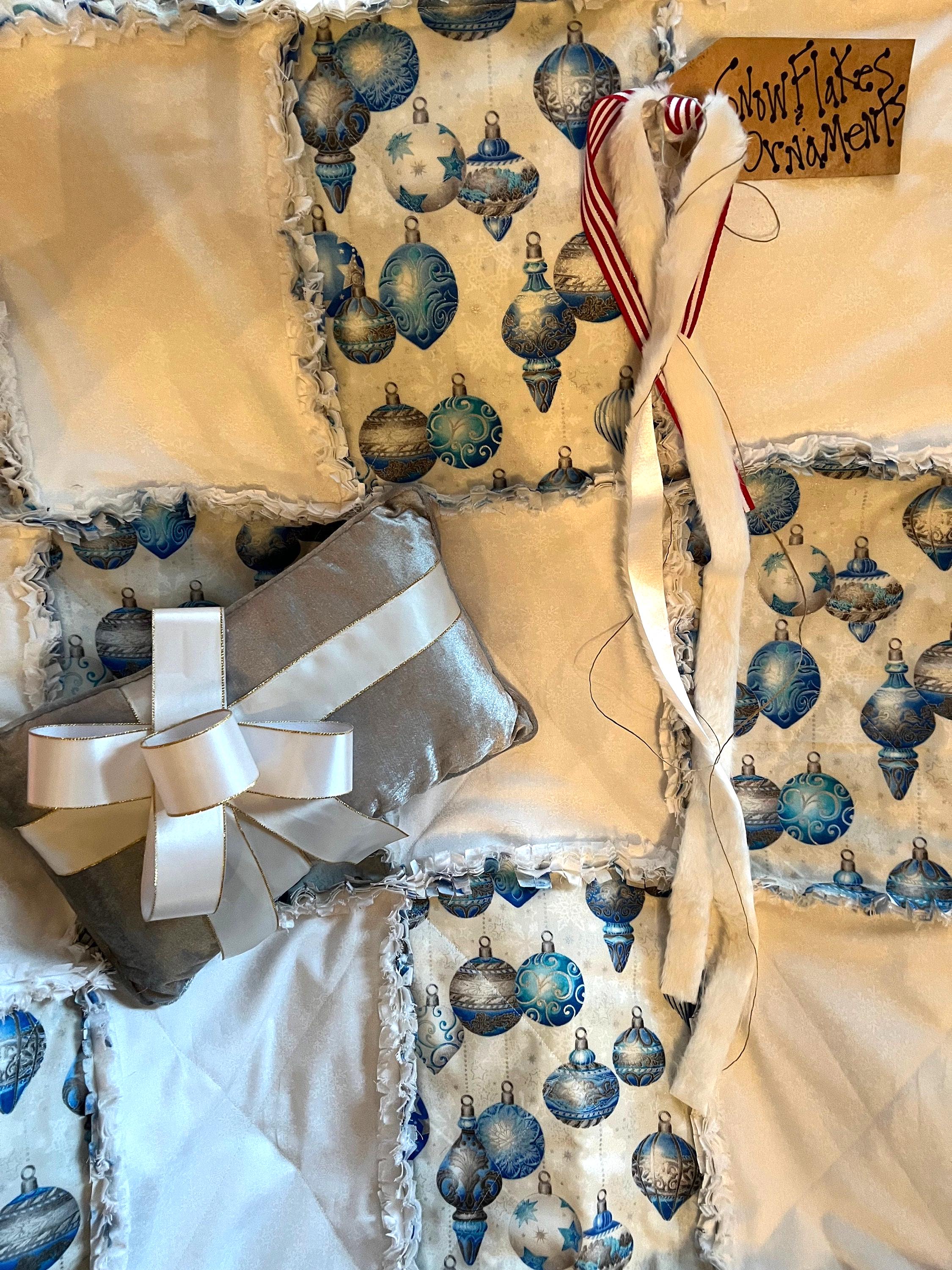 Christmas Blue Ornament Rag Quilt Throw. Handmade