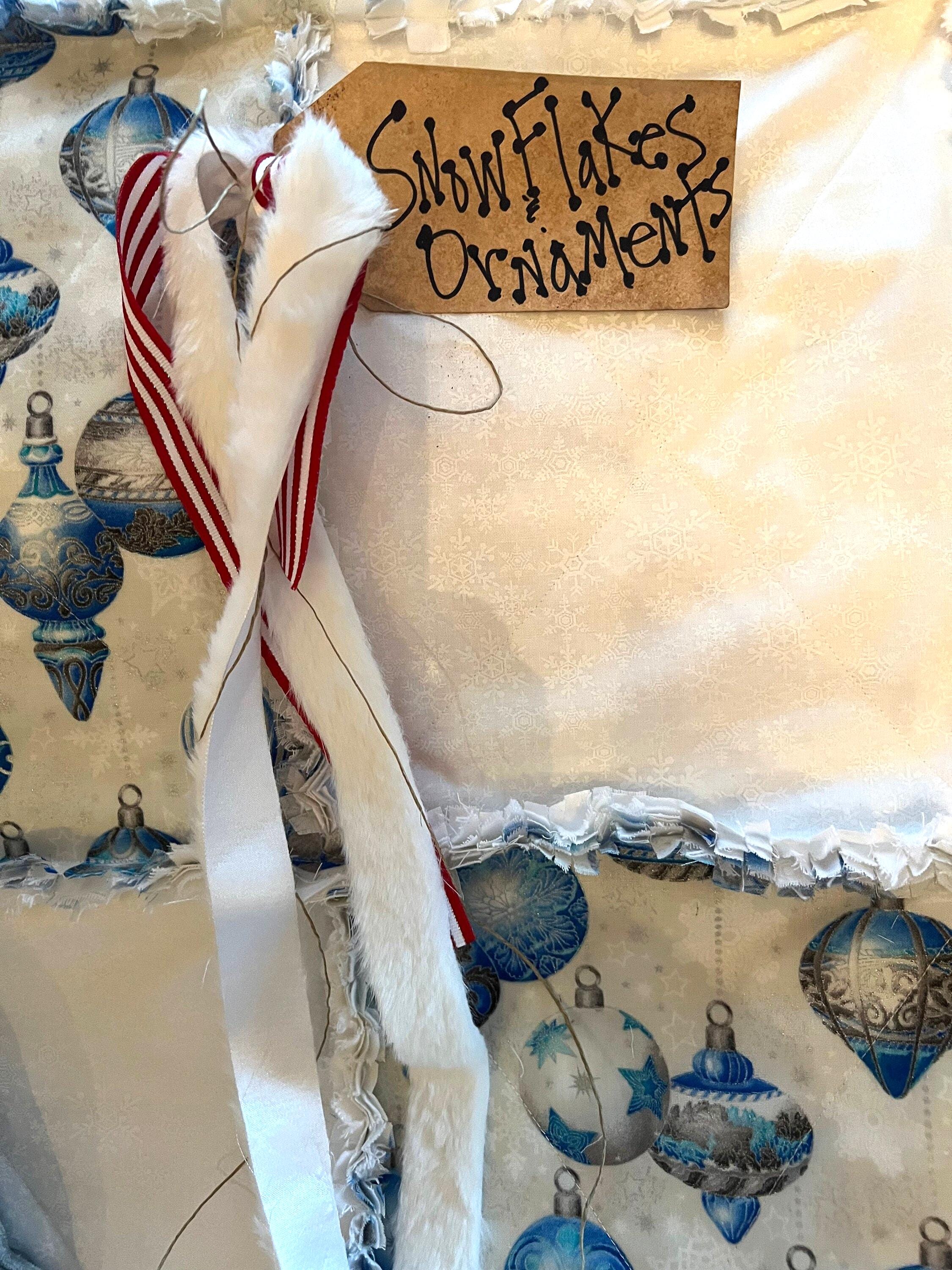 Made with 3 layers of fabric. A cotton white snowflake and a vintage blue ornament pattern. The middle is white flannel.