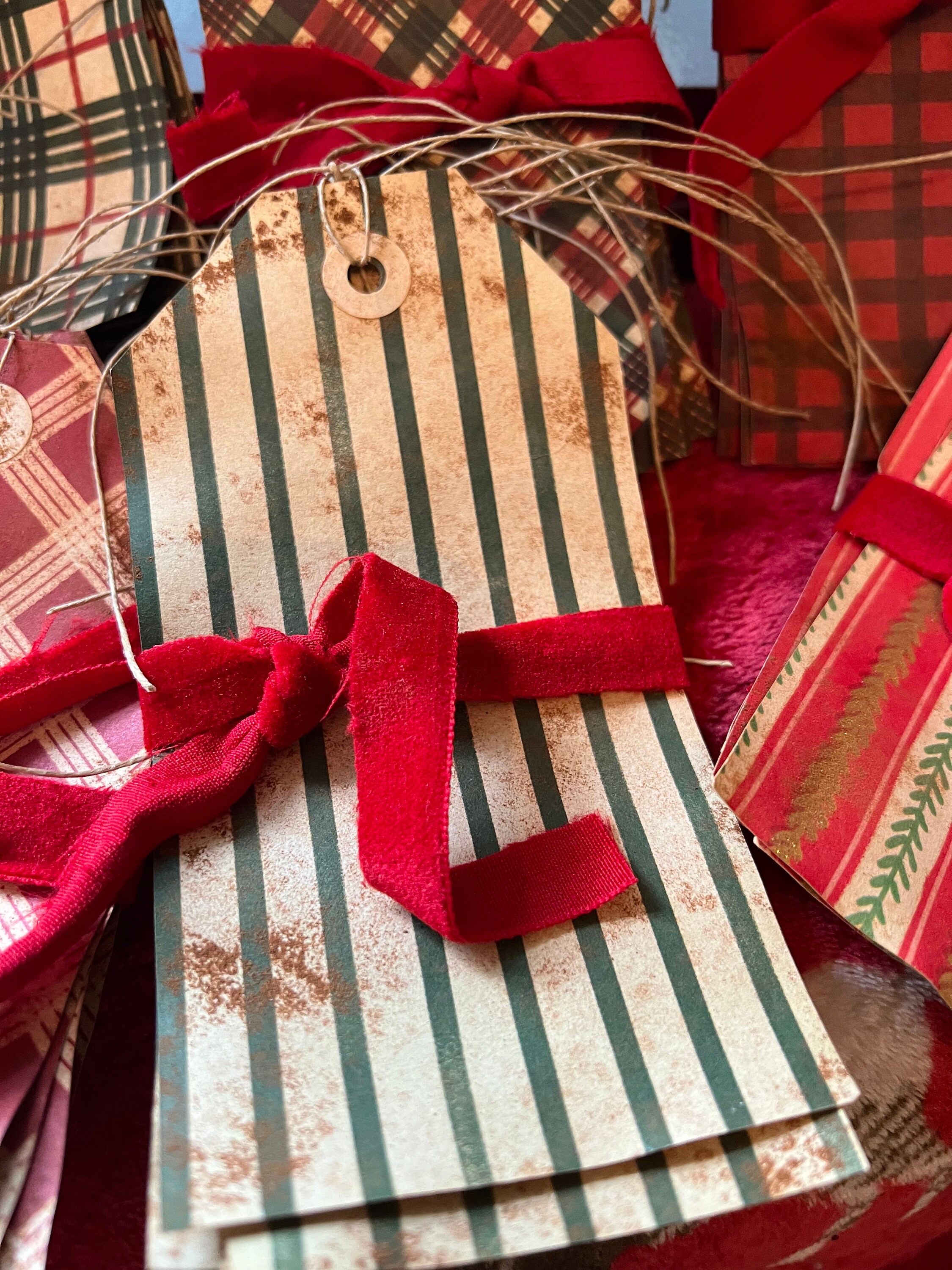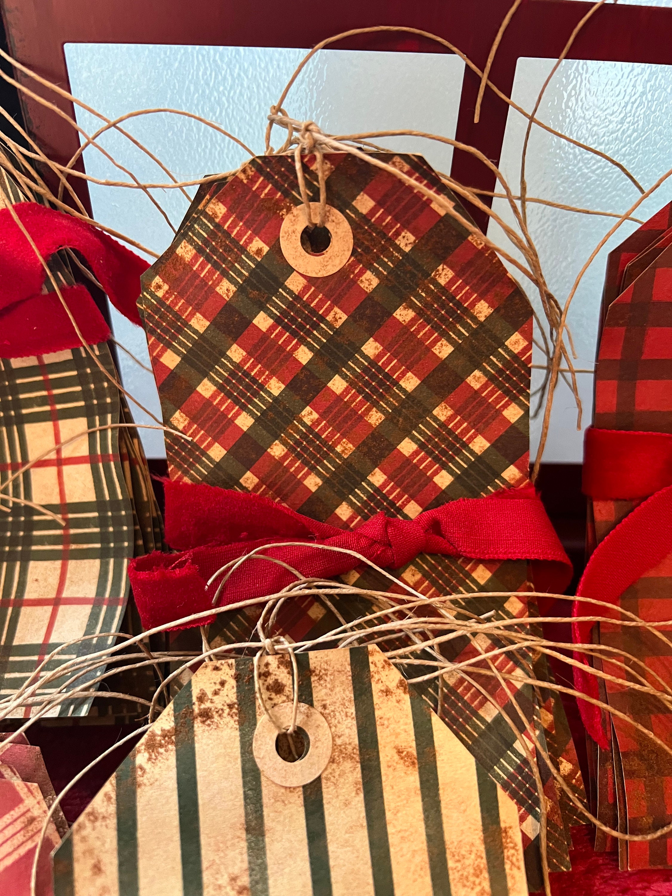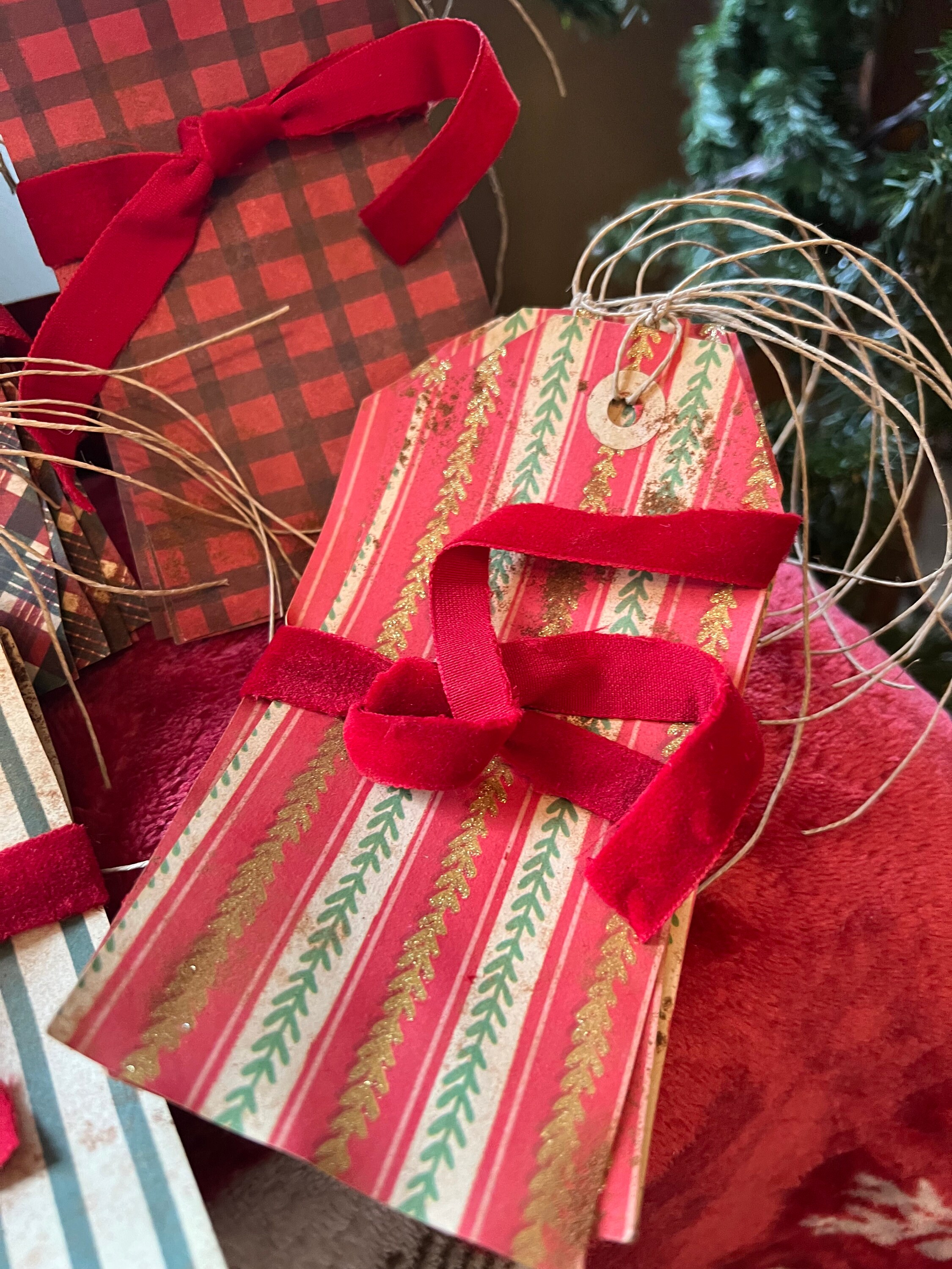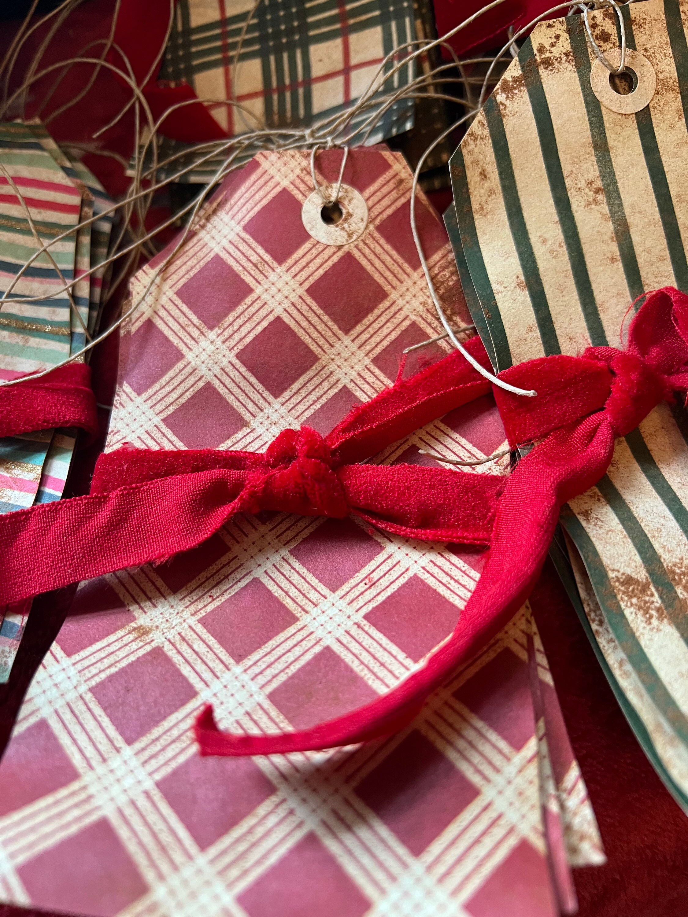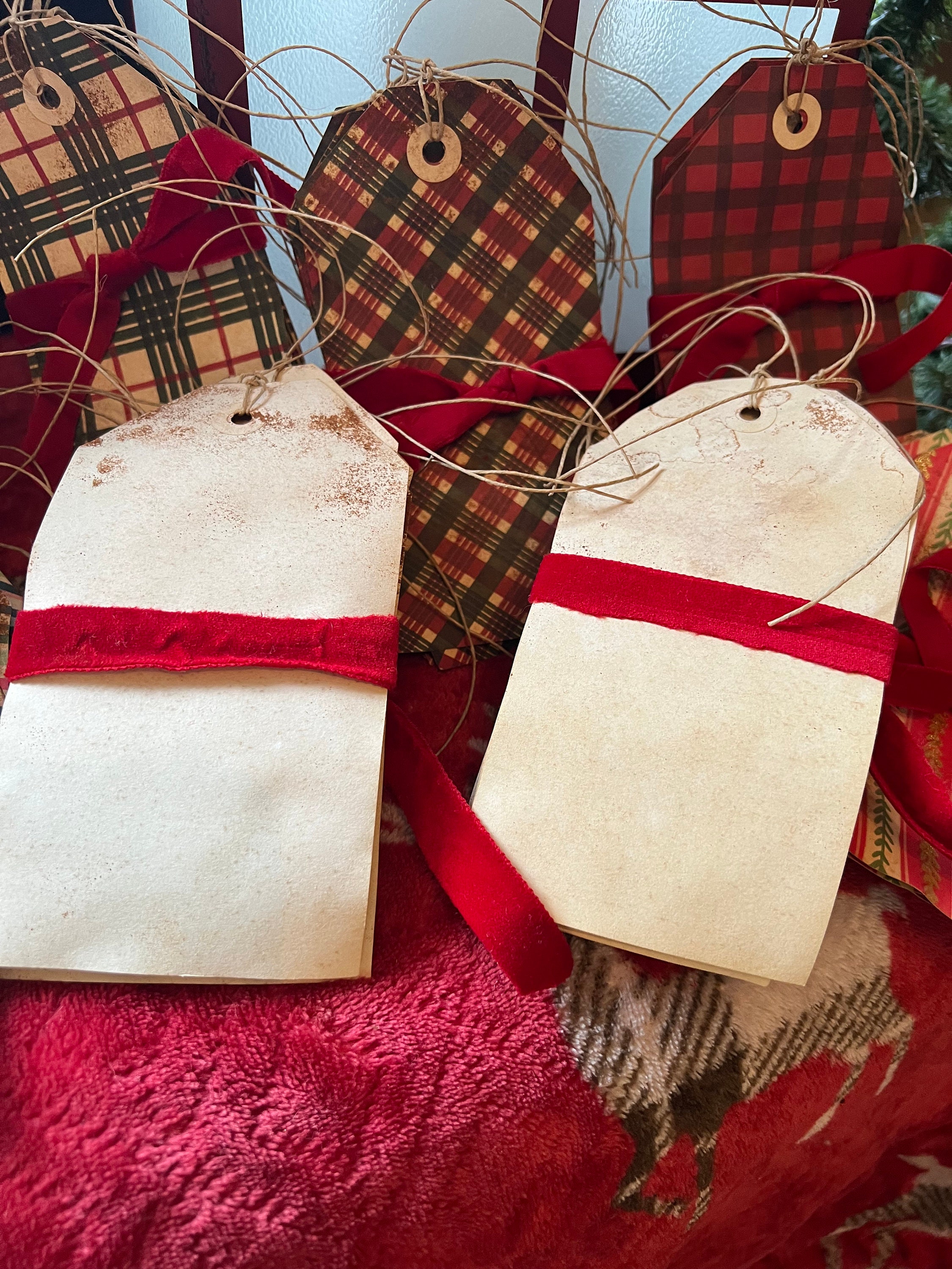 Primitive Christmas Gift Tags. Handmade 42 tags made with Christmas card stock paper, tea stain with cinnamon, wrapped in velvet ribbon. 7 designs, 6 each. The height varies from 5-6 inches height. Perfect for a Country Christmas theme.