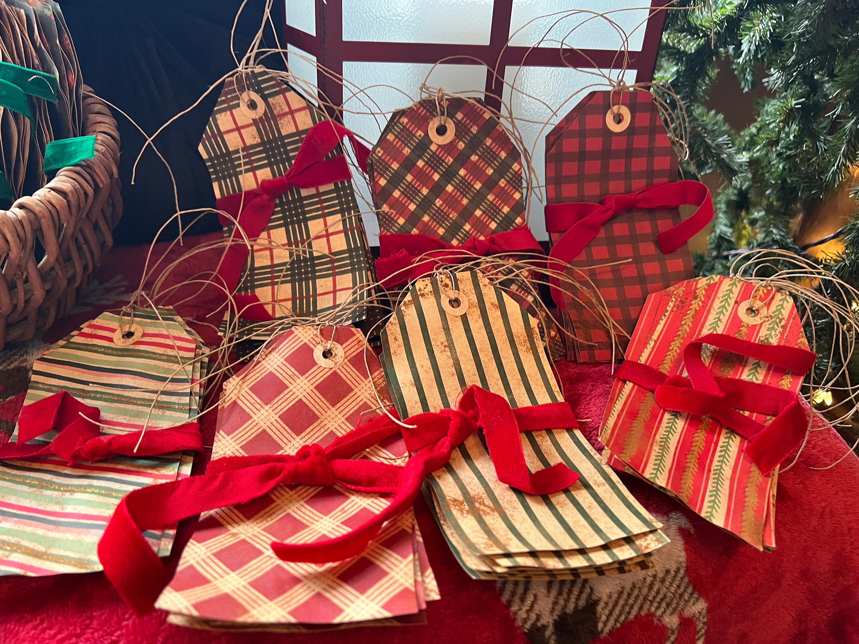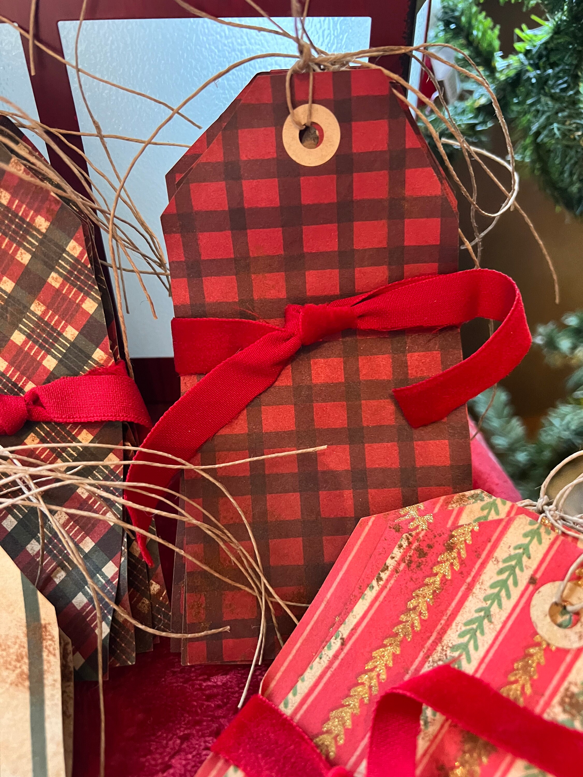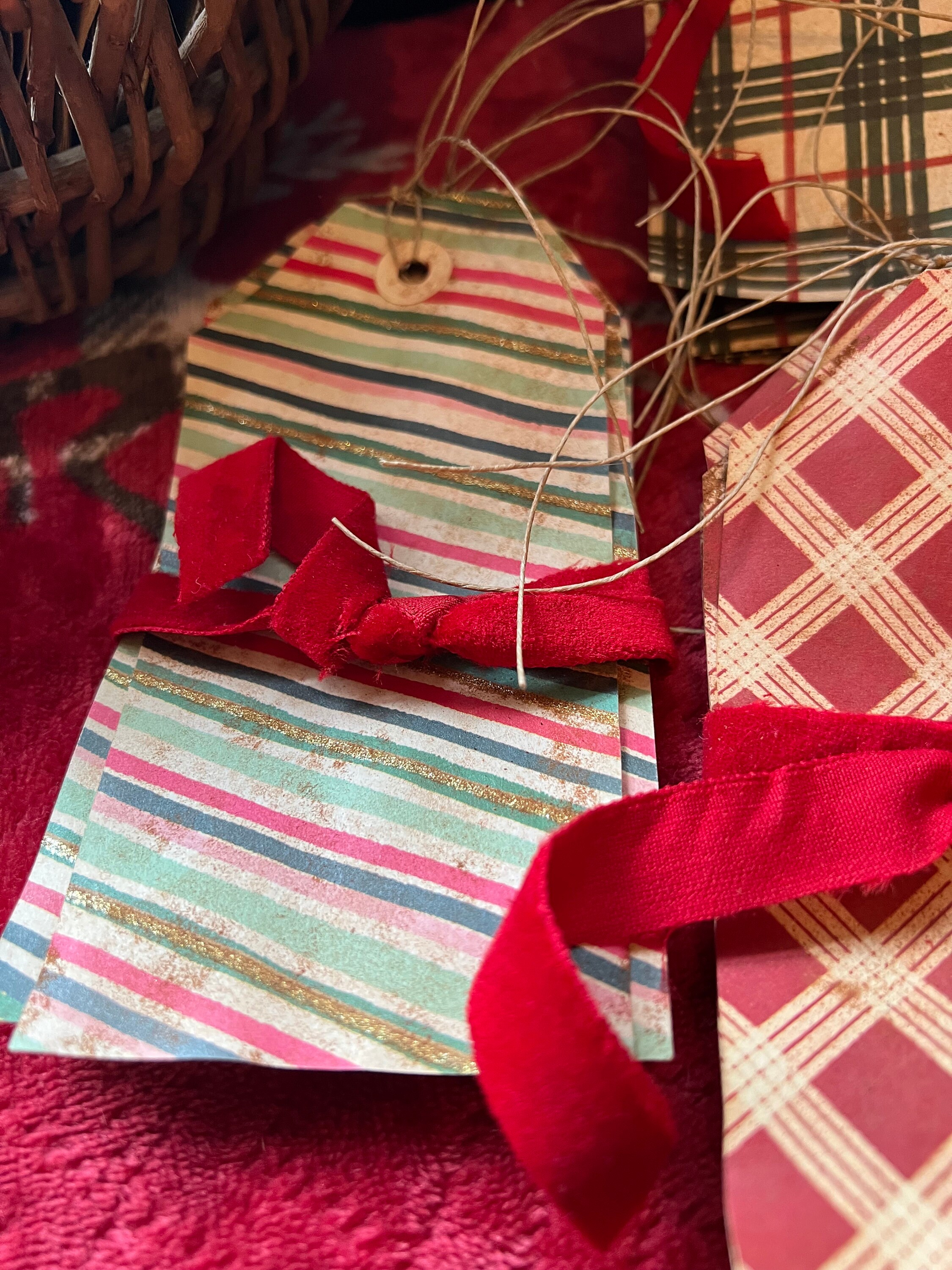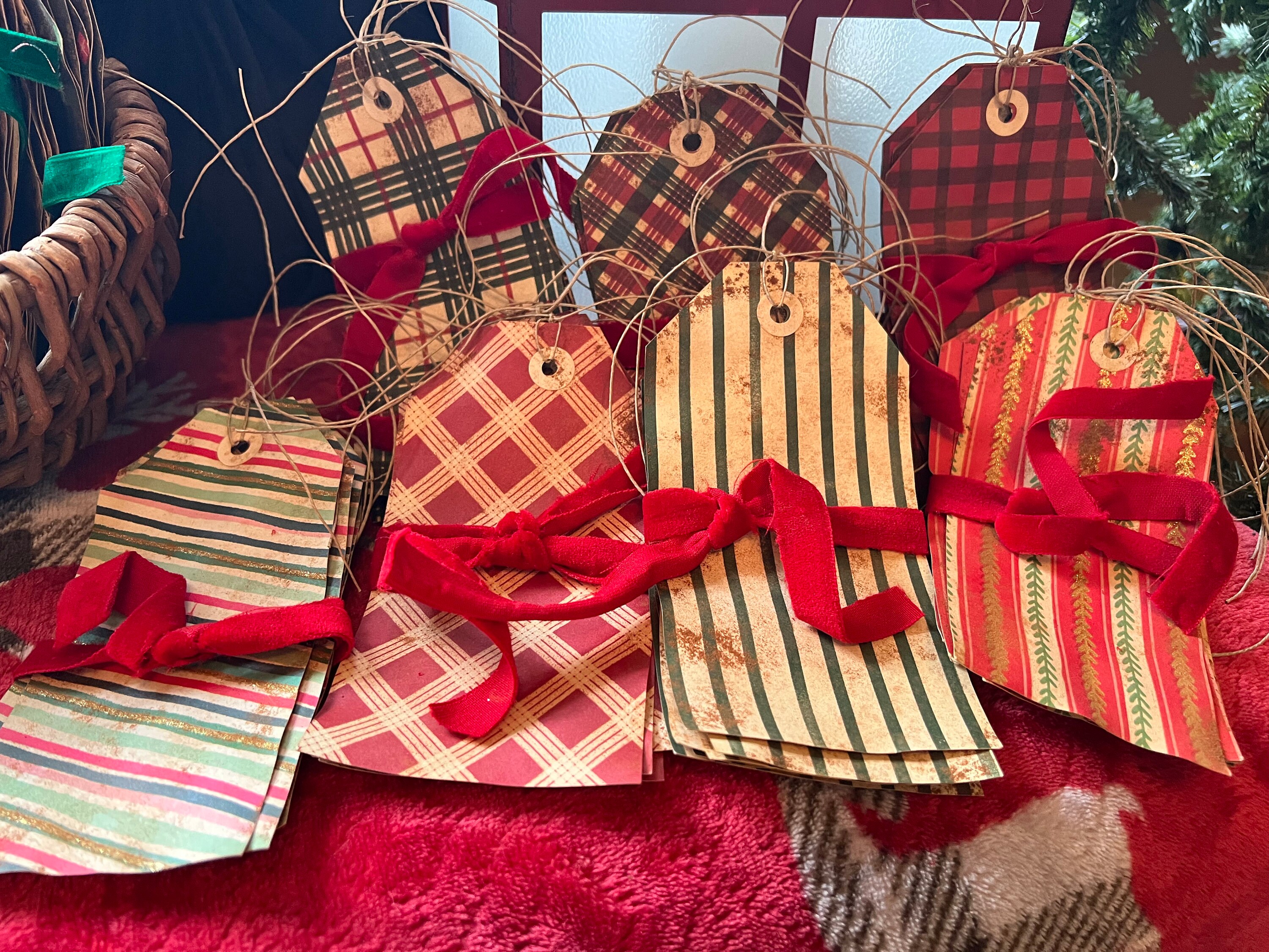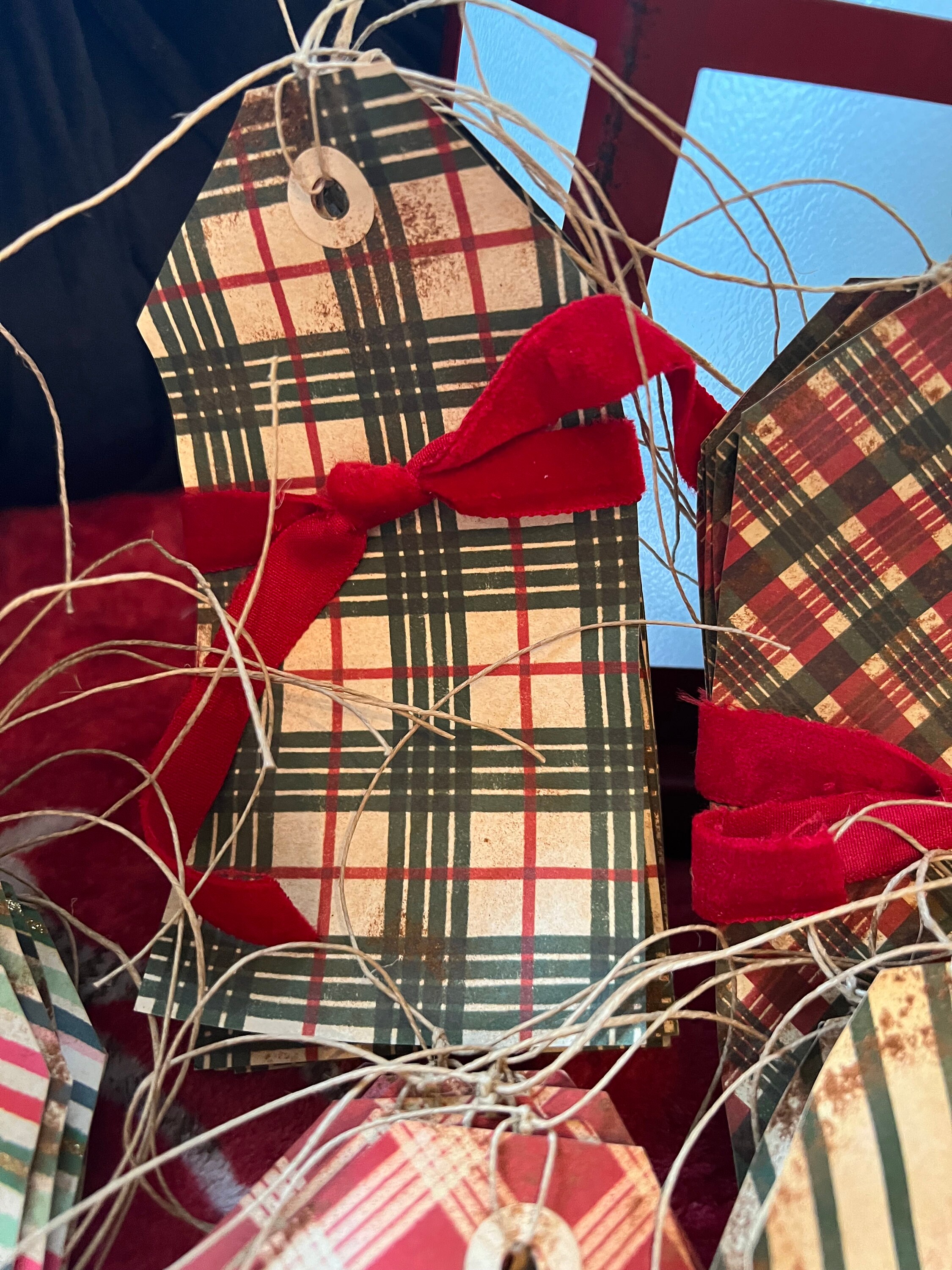 Primitive Christmas Gift Tags. Handmade 42 tags made with Christmas card stock paper, tea stain with cinnamon, wrapped in velvet ribbon. 7 designs, 6 each. The height varies from 5-6 inches height. Perfect for a Country Christmas theme.